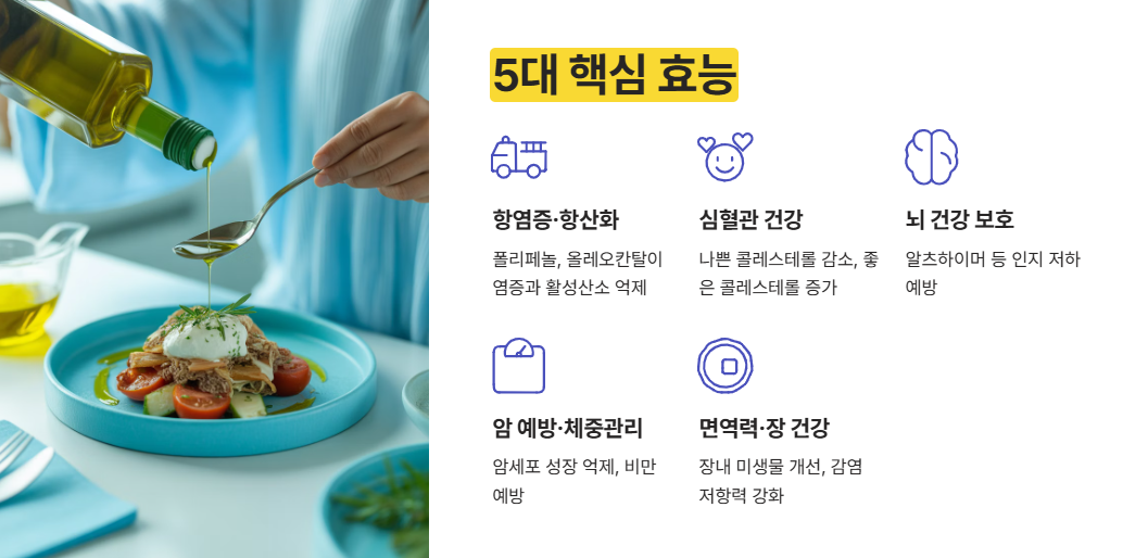 • 항염증 및 항산화 작용: 폴리페놀, 올레오칸탈 성분이 염증과 활성산소를 억제해 만성질환 위험을 낮춥니다.
