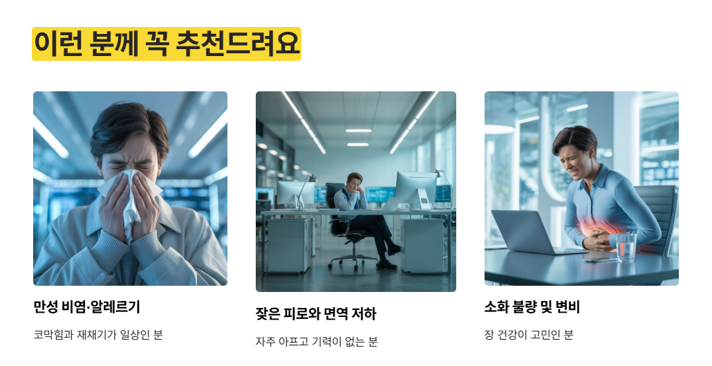 💡 이런 분께 꼭 추천드립니다! 만성 코막힘/비염/알레르기, 잦은 피로와 면역 저하, 소화 불량 및 변비