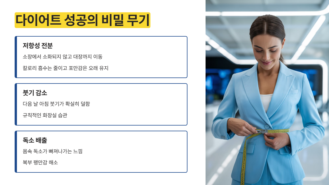 사실 많은 분들이 가장 궁금해하실 부분은 역시 '다이어트'겠죠. 카무트에는 '저항성 전분'이라는 게 들어있어요. 이게 참 재미있는 녀석인데, 소장에서 소화되지 않고 대장까지 내려가서 식이섬유처럼 행동해요. 즉, 칼로리 흡수는 줄이고 포만감은 오래 유지시켜 준다는 뜻입니다.