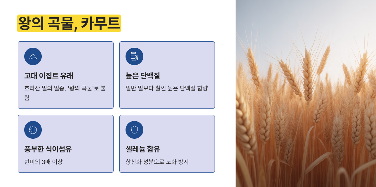 카무트, 이름부터 뭔가 신비롭지 않나요? 이건 고대 이집트에서 재배되던 '왕의 곡물'이라고 불리는 호라산 밀의 일종이에요. 일반 밀보다 단백질 함량이 훨씬 높고, 식이섬유는 무려 현미의 3배가 넘는다고 하니 말 다 했죠. 특히 셀레늄이라는 항산화 성분이 풍부해서 노화 방지에도 탁월하다고 알려져 있습니다.
